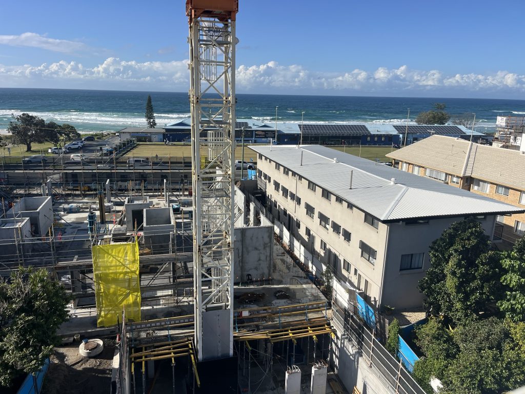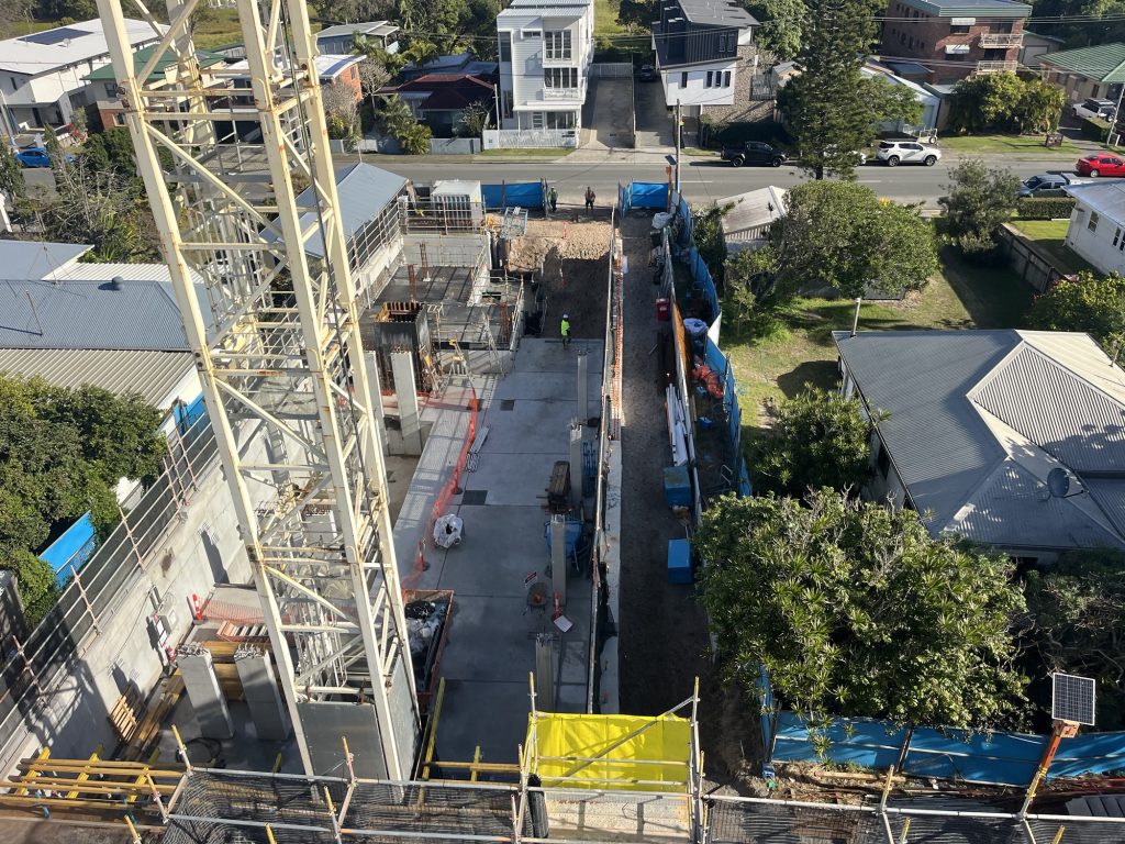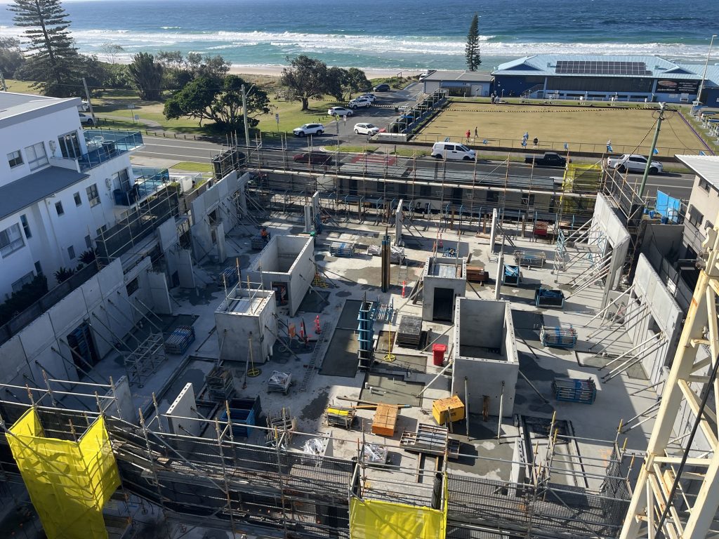 Progress at Marine & Pearl in Kingscliff continues at pace, with the project advancing steadily despite the adverse weather conditions experienced throughout March. The site team has shown exceptional resilience and adaptability, maintaining strong momentum as the development begins to transition out of the basement and into vertical structure works.